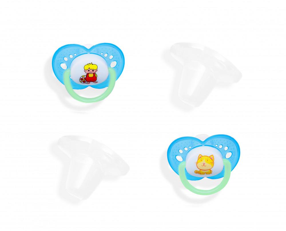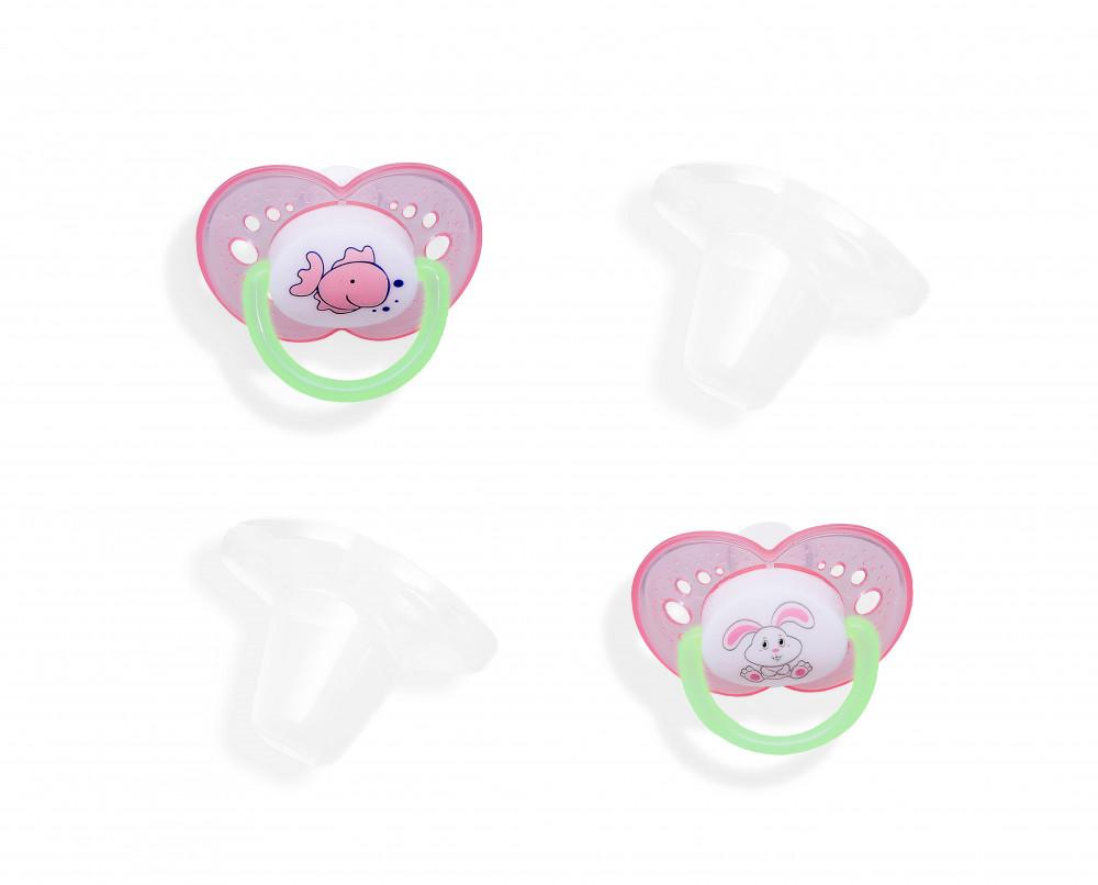 Kíváló minőségű 2db-os ortodontikus, BPA mentes, anatómiai formájú, szilikon játszócumi, védő kupakkal 0-6 hónapos korig, sötétben világító karikával.